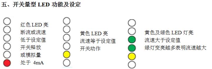 將流量開關(guān)裝好,使介質(zhì)以需要監(jiān)測(cè)的流速流動(dòng),擰開面板上的螺絲,調(diào)整電位計(jì), 使第一個(gè)綠色LED怡好變亮。此后當(dāng)流速低于當(dāng)前值時(shí),開關(guān)就釋放(紅燈亮)。若要使開關(guān)點(diǎn)比當(dāng)前流速小,可調(diào)整電位計(jì)(順時(shí)針旋轉(zhuǎn)螺絲刀)使綠色 LED多亮一些。