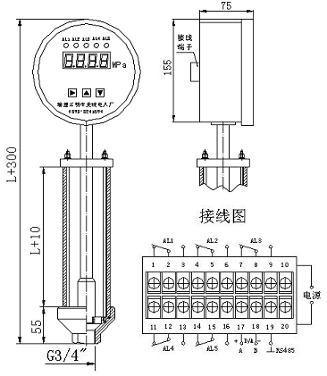 例:表示量程150mm,隔離膜片316L不銹鋼接口,數(shù)碼管LED顯示,2個(gè)接點(diǎn)輸出,G3/4鋁合金,4~20mA輸出,工作電源AC/DC220V。