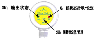3、待流速穩(wěn)定后,調(diào)節(jié)“SET”螺絲,使流量開關從Q狀態(tài)(紅燈亮)剛好轉入ON狀態(tài)(綠燈亮)。